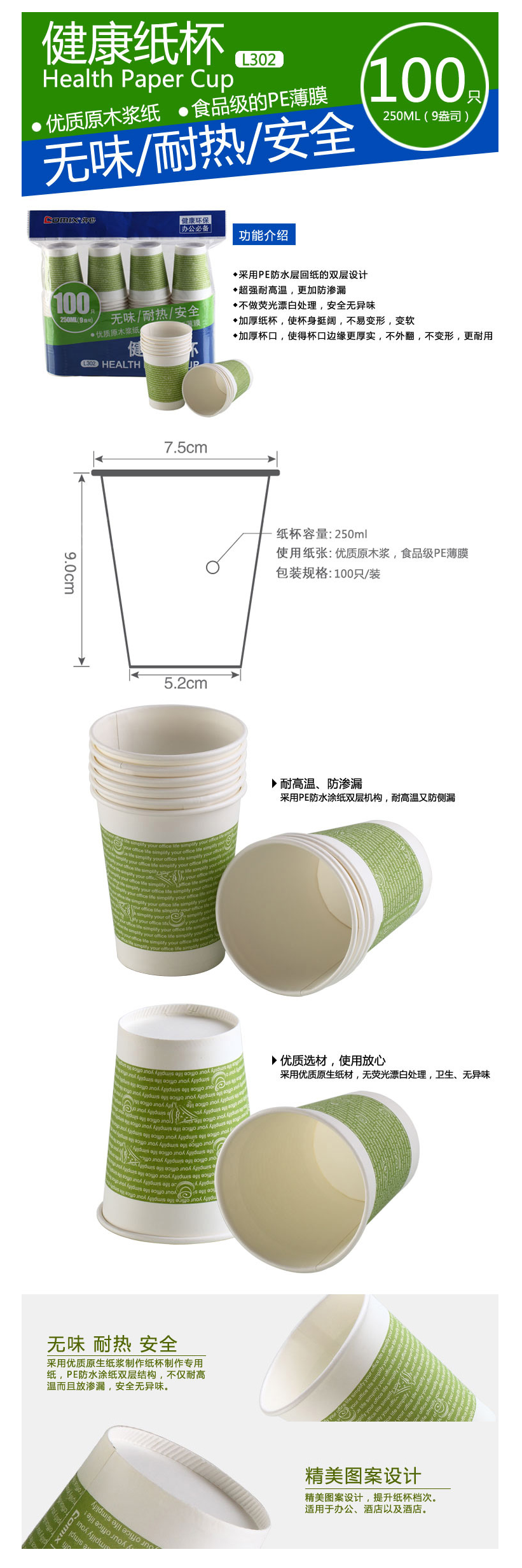 齐心(COMIX)L302(白)健康纸杯100个装(9安)