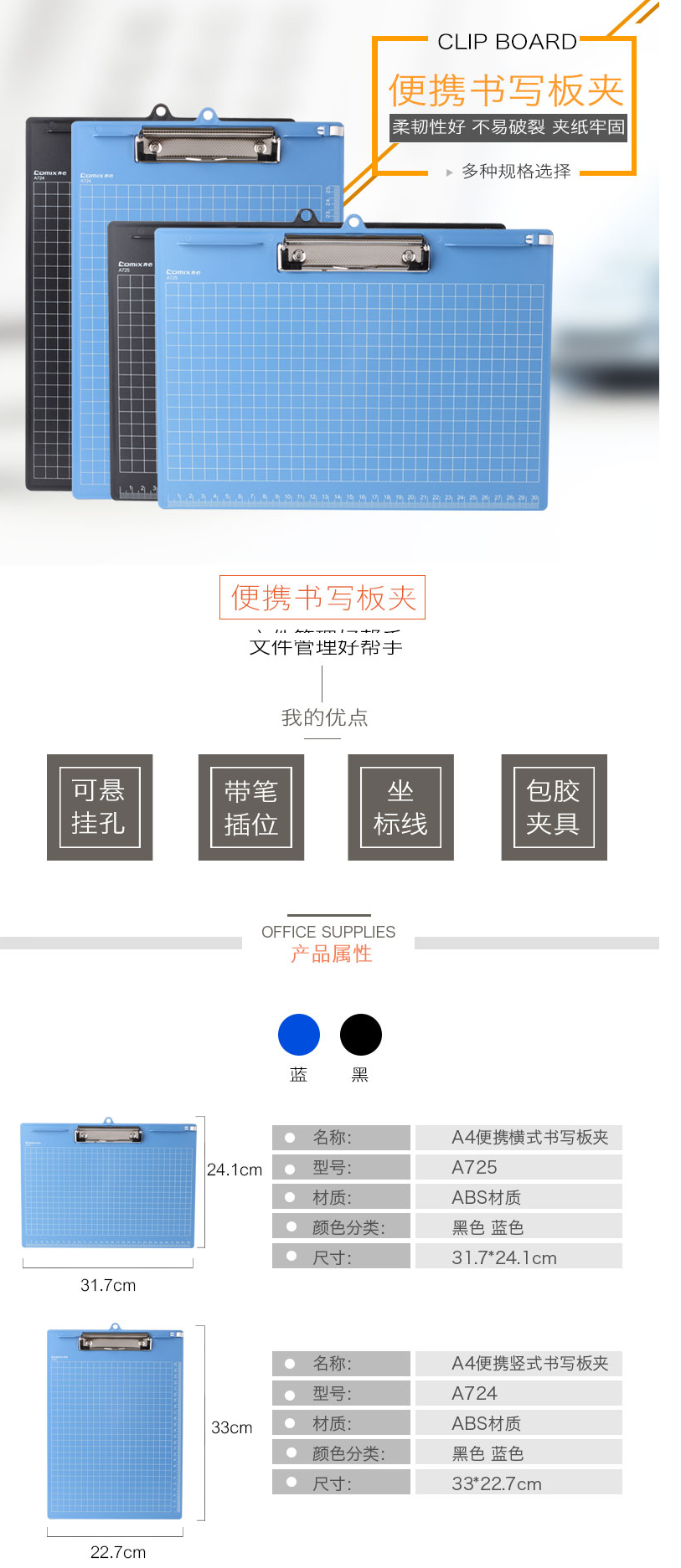 齐心(COMIX)A724(蓝)便携式书写板夹竖式A4