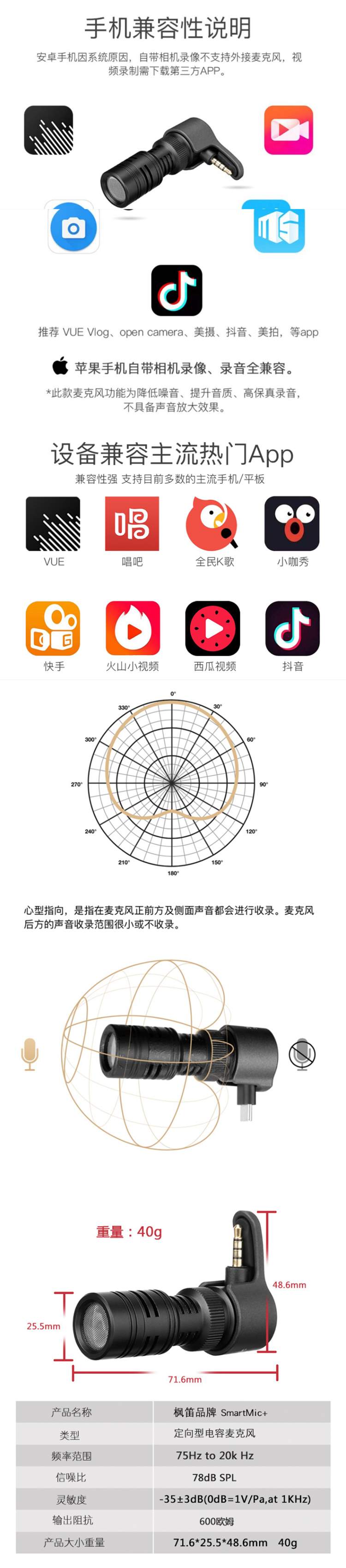 枫笛(Saramonic)麦克风 苹果Lightning接口直插式心型指向迷你麦克风 手机直播收录音小话筒 SmartMic+ Di